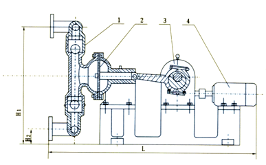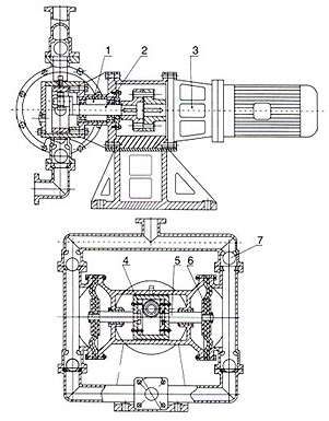 電機(4)通過減速箱(3)帶動左右兩端柱塞上面的隔膜(2)一前一后往復運動。在左右兩個泵腔內(nèi),裝有上下四個單向球閥(1)隔膜的運動,造成工作腔內(nèi)的容積的改變,迫使四個單向球閥交替地開啟和關閉,從而將液體不斷地吸入和排出。